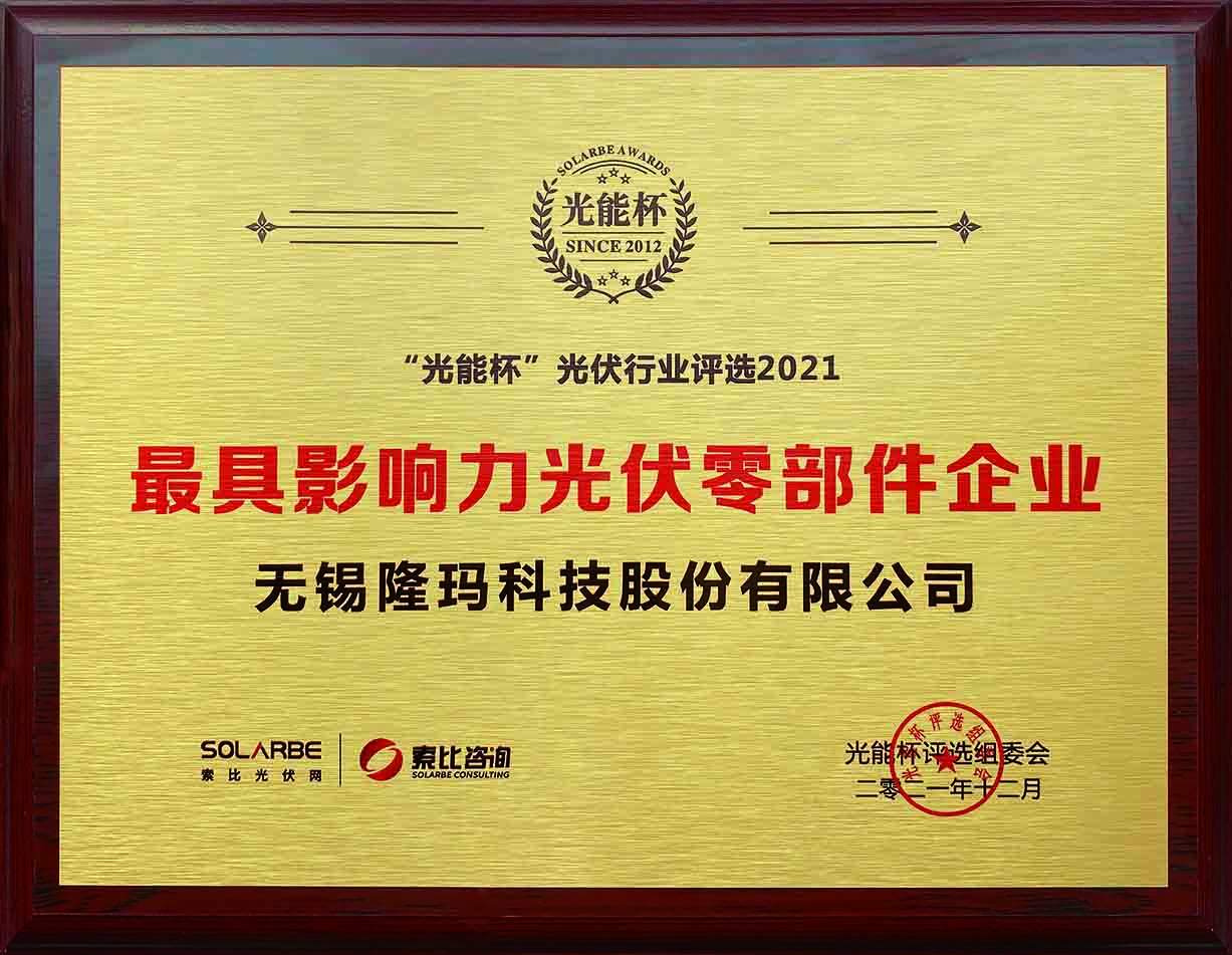 2022年1月6日,由索比光伏网、索比咨询联合主办的2021年度第三届“光能杯”跨年分享会暨第九届光能杯行业颁奖典礼在苏州如期举行。本届“光能杯”共有300余家光伏企业参与报名评选,旨在挖掘行业中坚力量,树立行业标杆,表彰在过去一年中对于光伏行业做出突出贡献和具有表率作用的卓越企业以及优秀管理者,推动行业转型升级健康发展。我司凭借强大创新力、出色的品质与服务、卓越的品牌影响力,蝉联2021年 “最具影响力光伏零部件企业” 大奖。