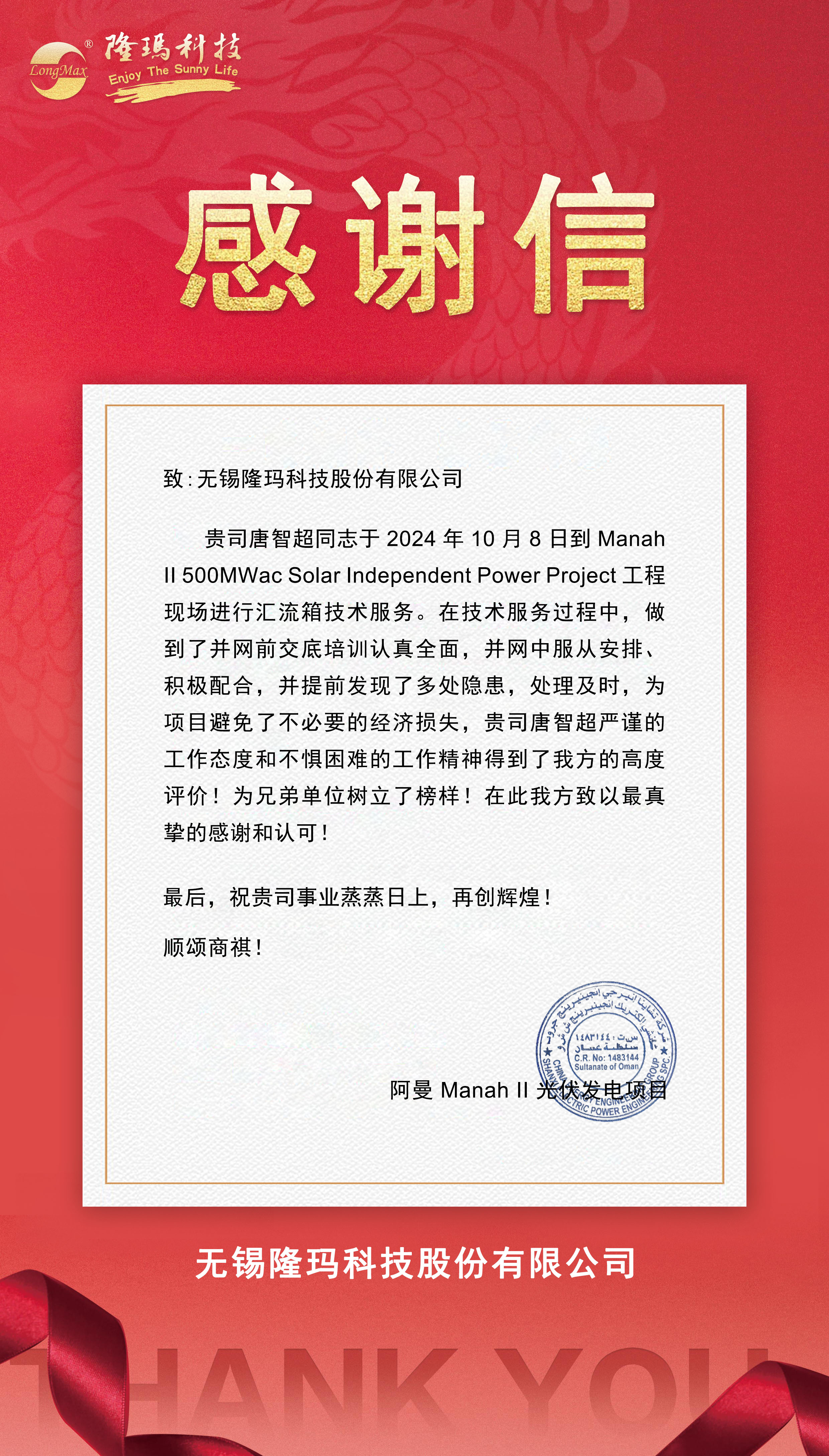 优质履约,实力赢赞!近日,一封感谢信自遥远的阿拉伯半岛南部过海而来,信中充分肯定了betway88西汉姆联售后服务团队成员唐智超在阿曼Manah II光伏电站项目服务中的出色表现,更对betway88西汉姆联对保障电站顺利建设做出的各方面积极贡献赞誉满满。